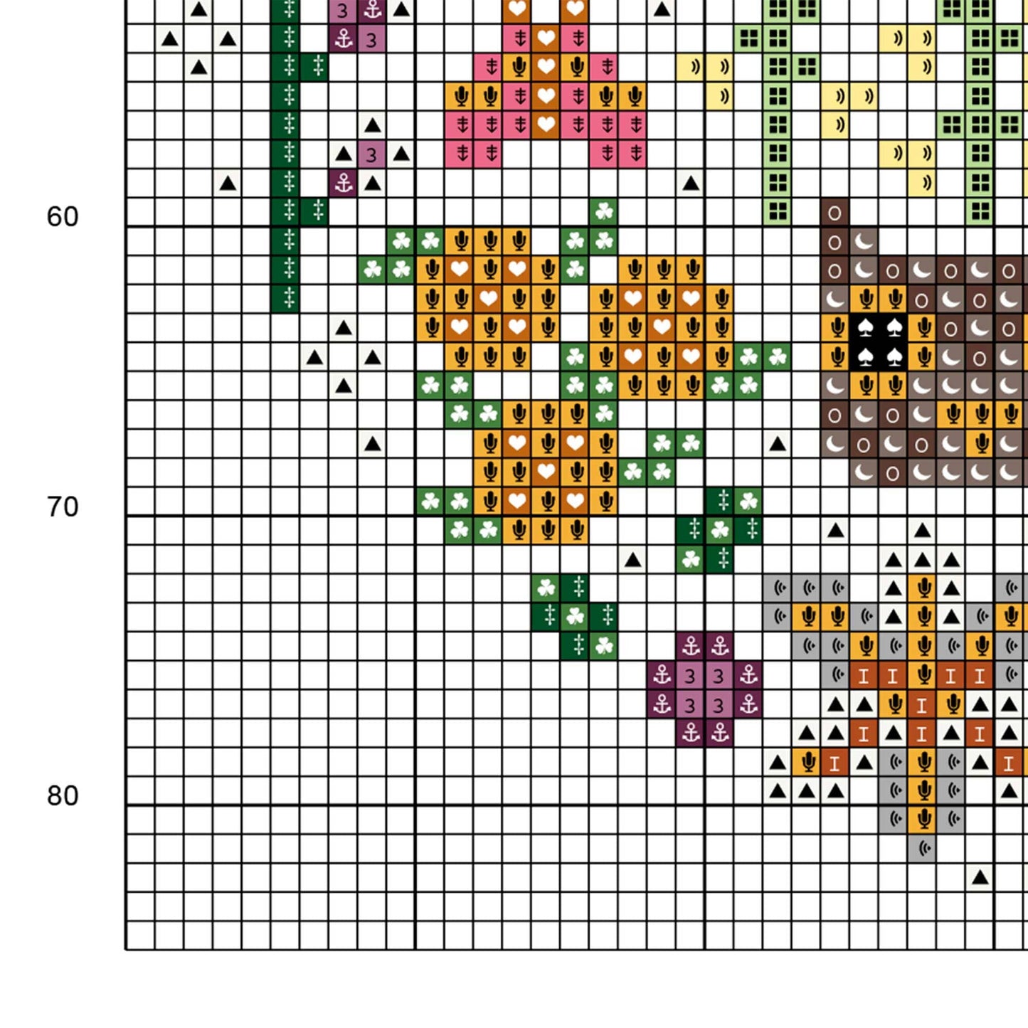 - Tamaño: 85x85 puntos (15x15 cm bordado en tela Aida de 14ct)