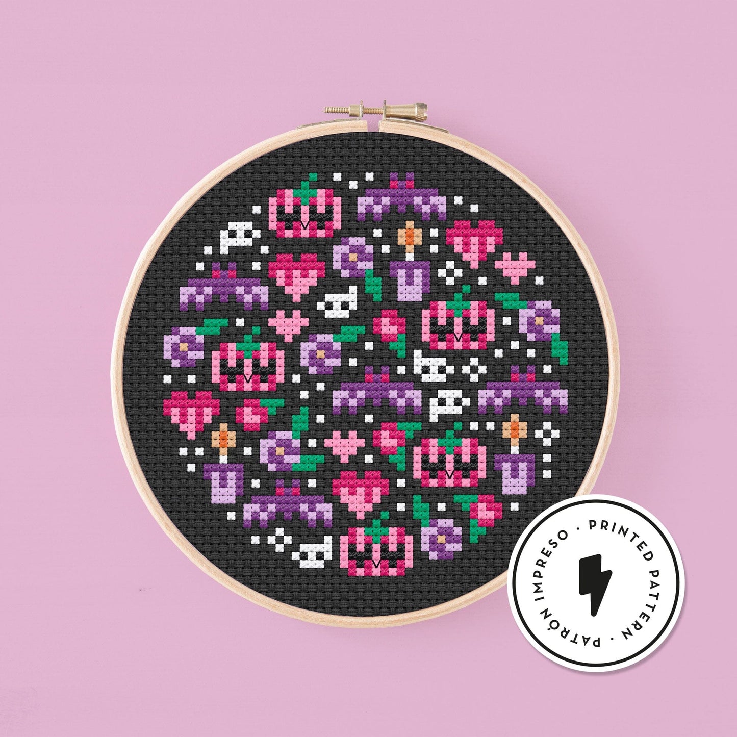 Patrón para bordar un jardín muy muy mini y doblemente mono: primero, porque es super chiquitito y segundo porque está inspirado en el Valloween. ¿No sabes lo que es? Te cuento: Valloween es una mezcla entre San Valentín y Halloween. Halloween pero con corazones y todo rosa. Cuando me enteré de que existía no pude resistirme a hacer una mini colección de pequeños diseños.