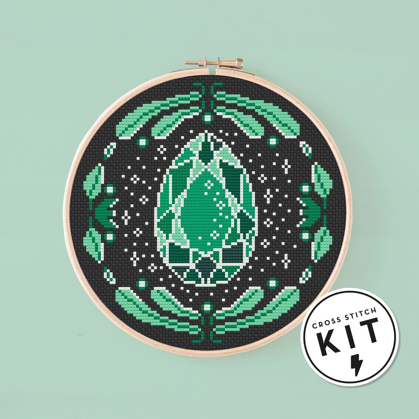 Kit para bordar a punto de cruz una preciosa gema tallada en forma de lágrima. Esta gema es de color verde, así como todos los elementos que la rodean, que le dan una aura mágica y misteriosa. Bordada sobre tela negra queda maravillosamente bonita y con un ligero efecto tridimensional.