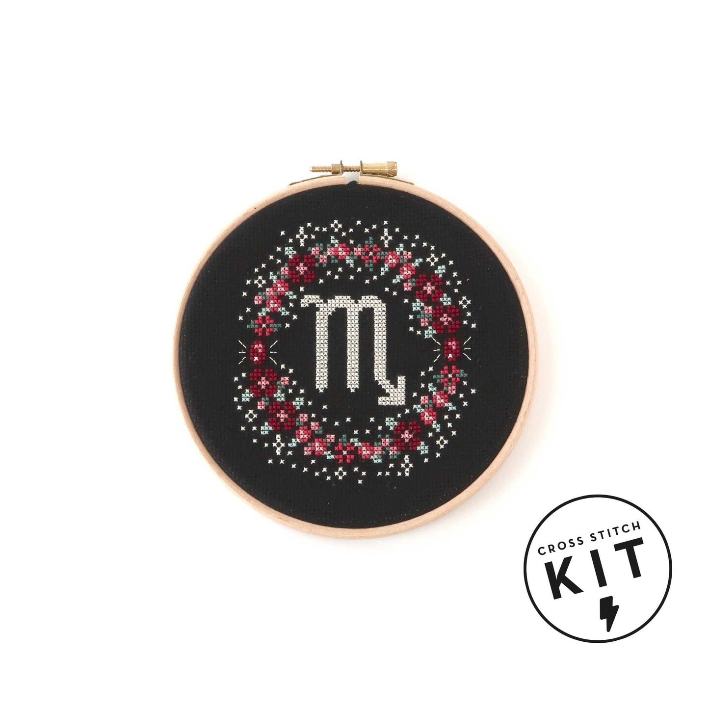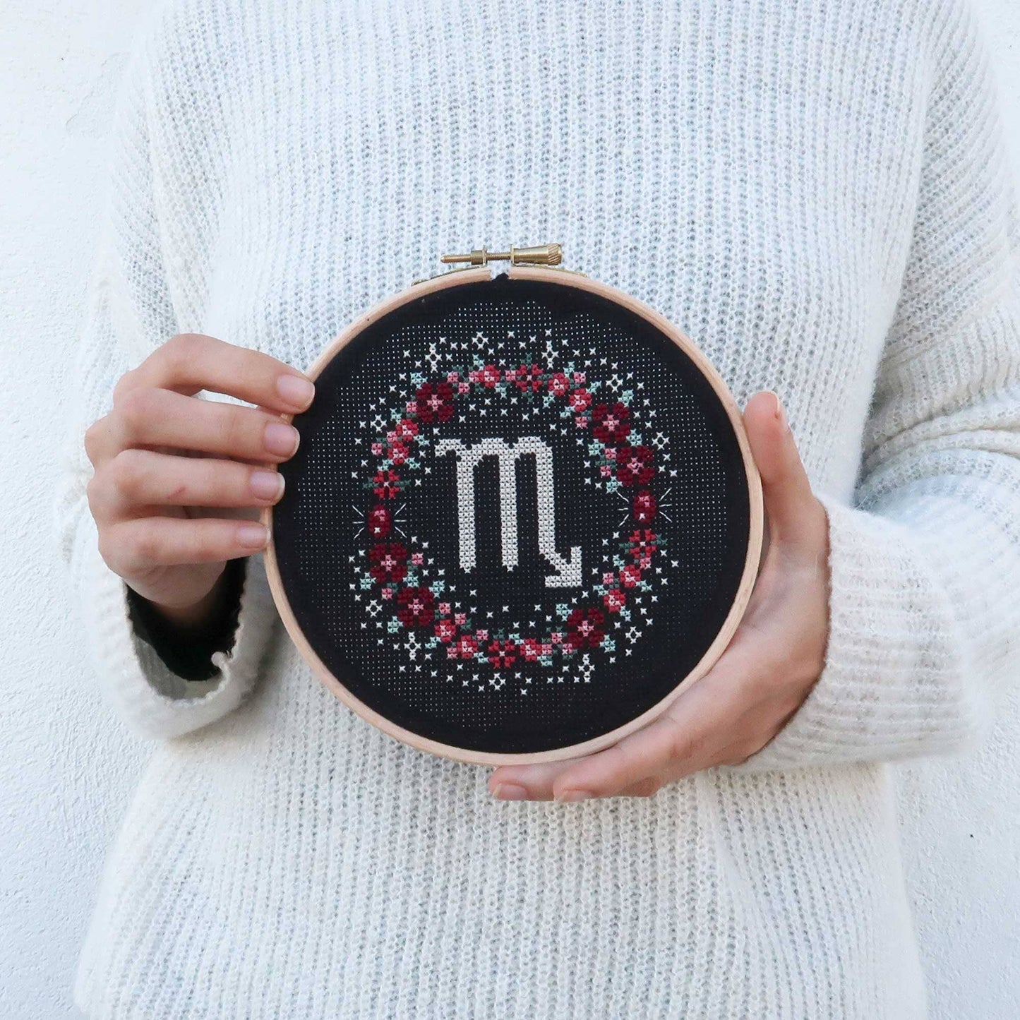 Kit para bordar a punto de cruz. El signo Escorpio es aquel que tienen todas las personas nacidas entre el 21 de octubre y el 21 de noviembre. Borda tu signo o haz un regalo súper chulo con este símbolo astrológico rodeado de una corona de flores y dos gemas en tonos granate (el color de Escorpio).