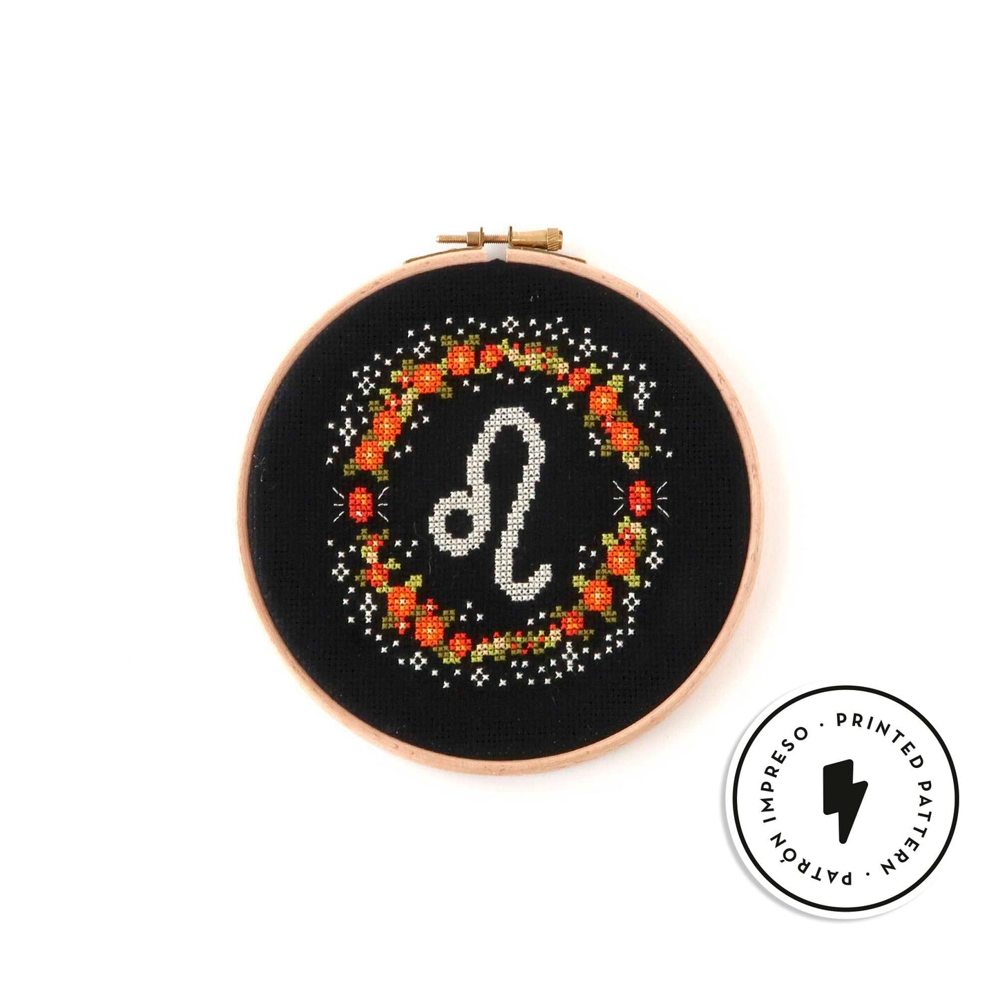 El signo Leo es aquel que tienen todas las personas nacidas entre el 21 de julio y el 21 de agosto. Borda tu signo o haz un regalo súper chulo con este símbolo astrológico rodeado de una corona de flores y dos gemas en tonos naranjas (el color de Leo).