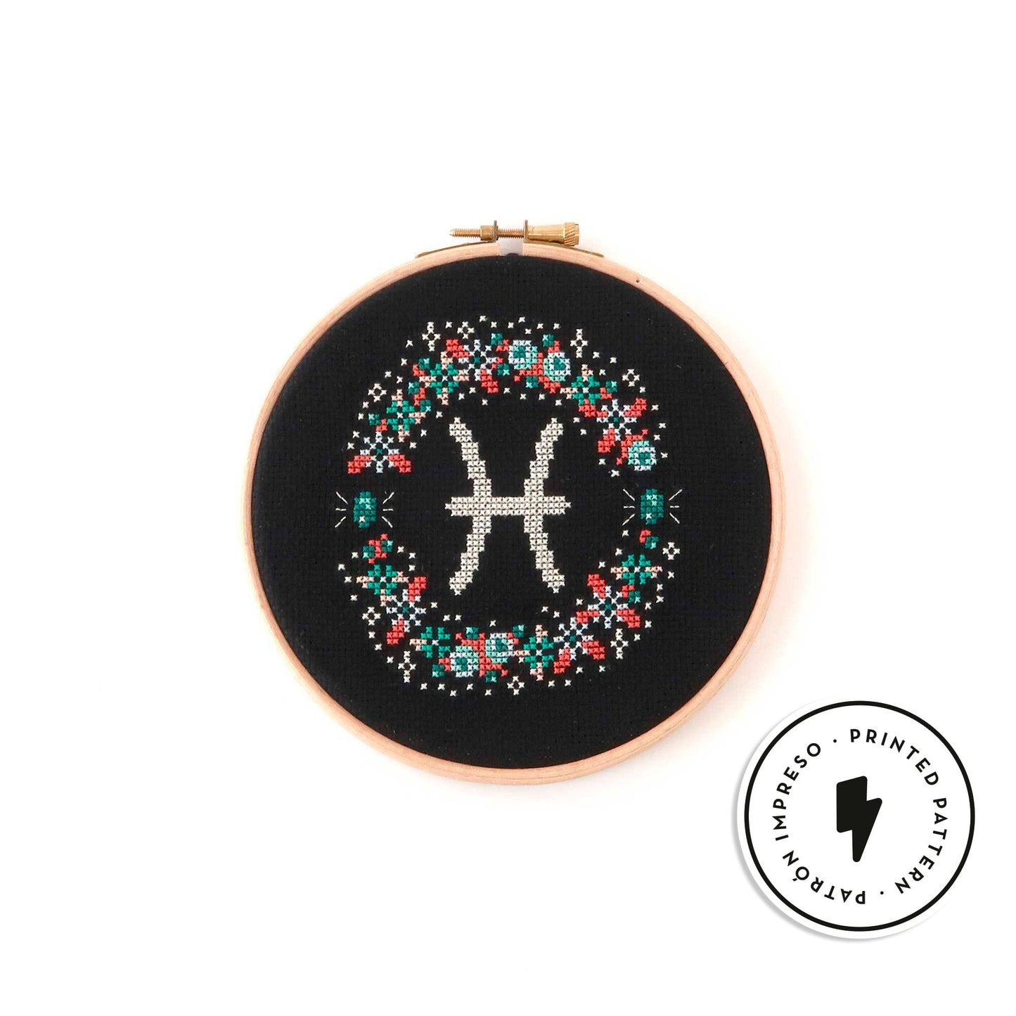 El signo Piscis es aquel que tienen todas las personas nacidas entre el 20 de febrero y el 20 de marzo. Borda tu signo o haz un regalo súper chulo con este símbolo astrológico rodeado de una corona de flores y dos gemas en tonos turquesas (el color de Piscis).