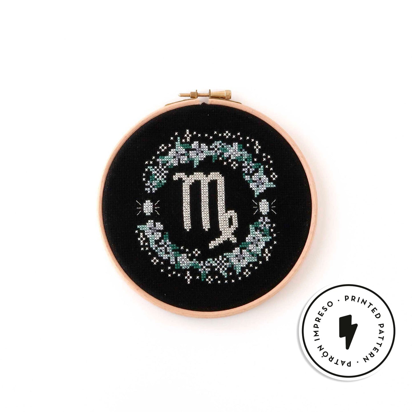 El signo Virgo es aquel que tienen todas las personas nacidas entre el 22 de agosto y el 20 de septiembre. Borda tu signo o haz un regalo súper chulo con este símbolo astrológico rodeado de una corona de flores y dos gemas en tonos blancos (el color de Virgo).