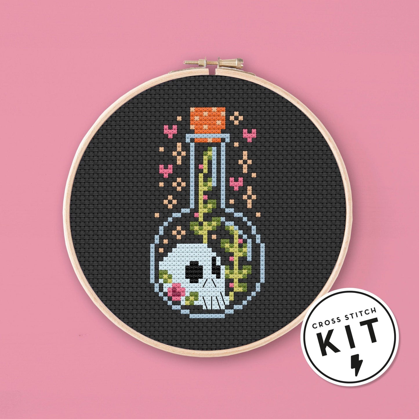 Cross stitch kit to embroider a potion bottle with a skull inside. This cute little cross stitch kit is a perfect project for beginners and is also great for trying out black Aida fabric for the first time. This embroidery will look great framed in a 10 centimeter (4 inches) hoop.