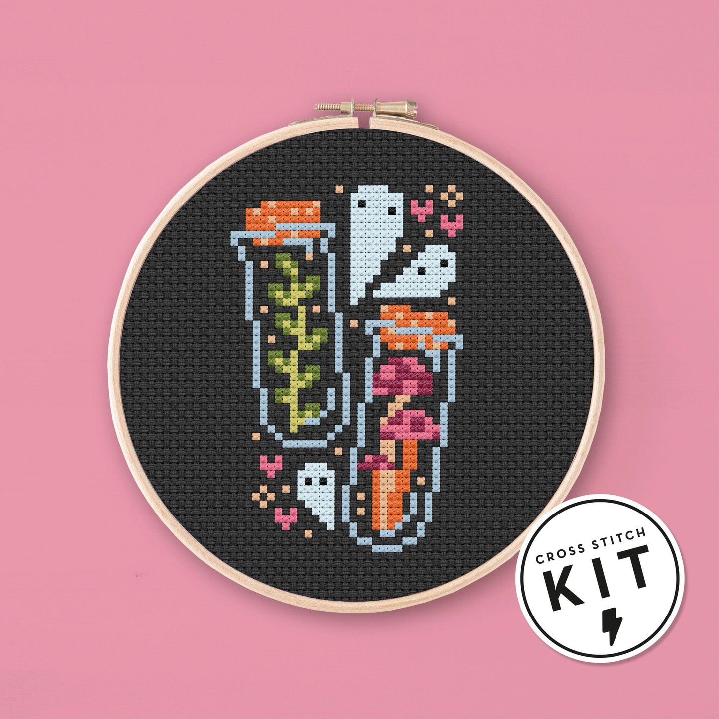 Cross stitch kit to embroider two potion bottles filled with magical ingredients: pink mushrooms and green leaves. This cute little cross stitch kit is a perfect project for beginners and is also ideal for trying out black Aida fabric for the first time. This embroidery will look great framed in a 10 centimeter (4 inches) hoop.