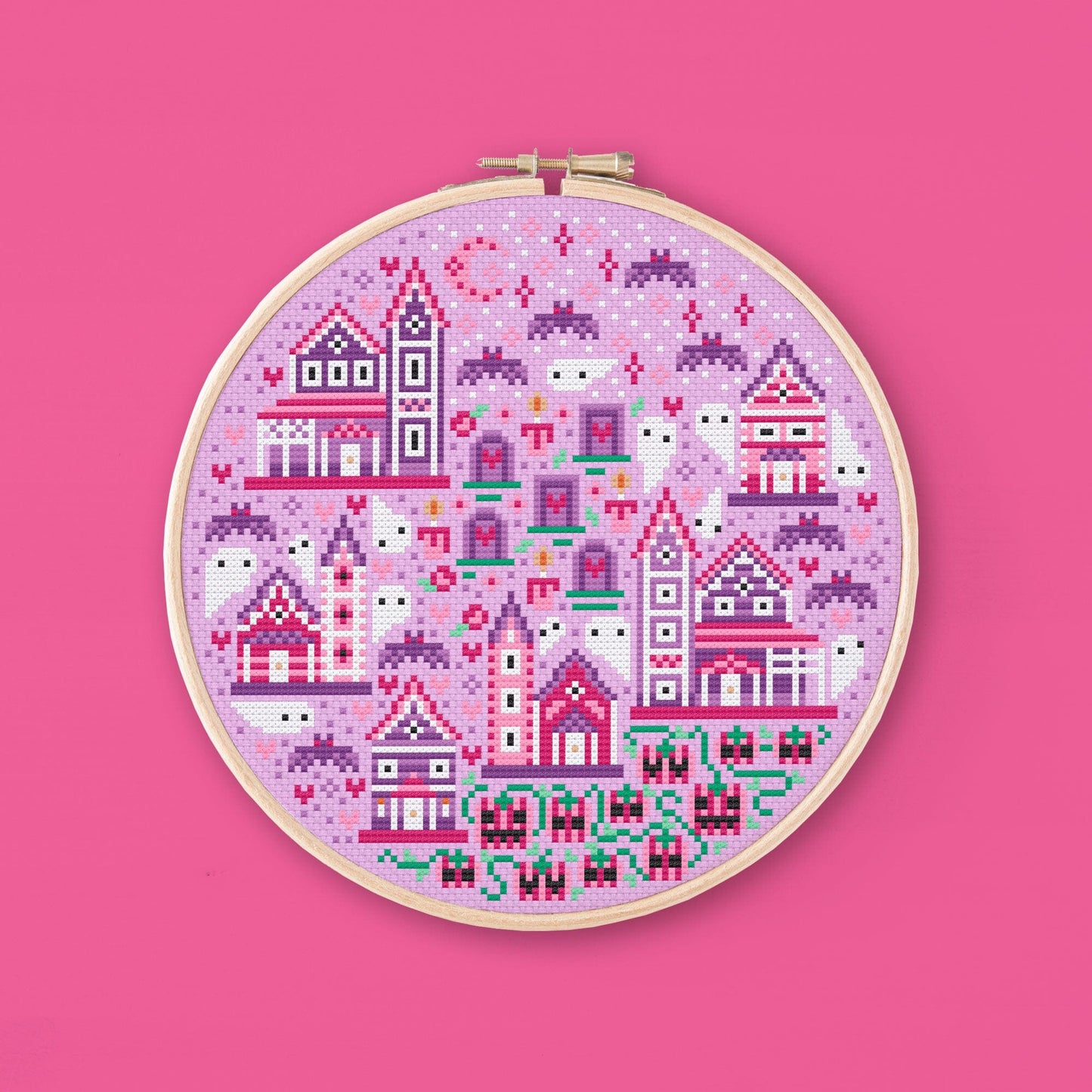 Cross stitch kit to embroider some pink and lilac houses among Halloween pumpkins and bats. Welcome to Valloween Town! Don't you know what it is? Let me tell you: Valloween is a mix between Valentine's Day and Halloween. Halloween but with hearts and all pink. When I found out it existed I couldn't resist.