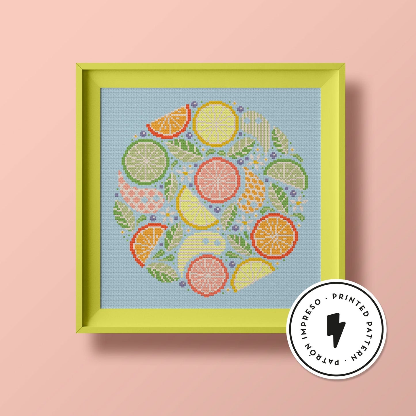 Patrón de punto de cruz para bordar unos fantasmas estampados volando entre rodajas de limón, lima, naranja y pomelo. Es un diseño veraniego de temática spooky, para amantes de lo misterioso que disfrutan del bordado también en verano.