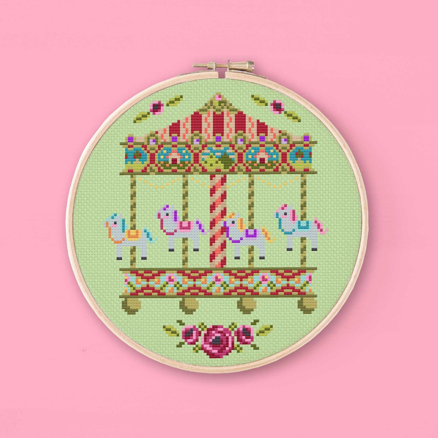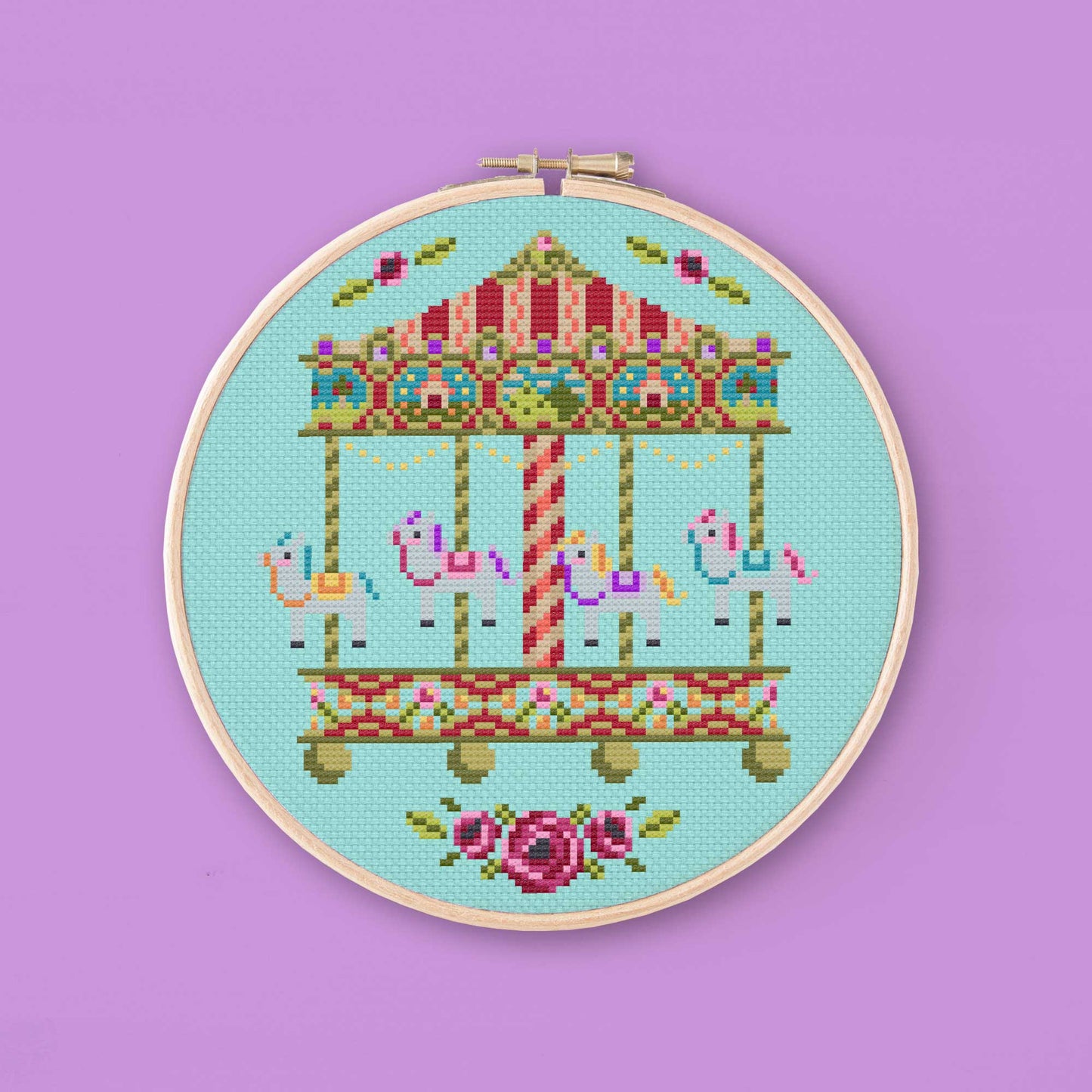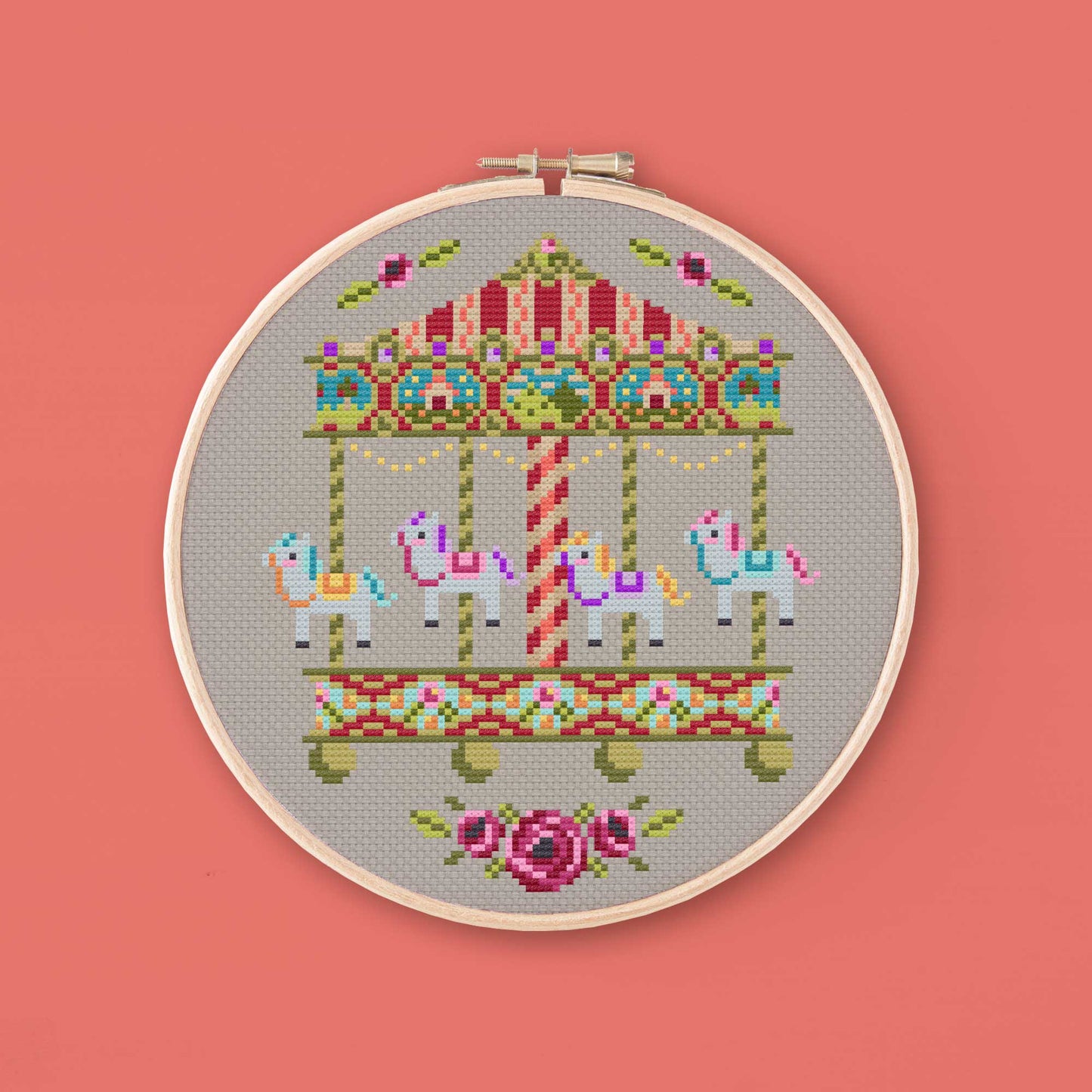 Inspired by antique merry go rounds and fairs, this cross stitch project will take you back to your childhood. To the smell of candy clouds and apples. Get ready for a ride in this delicate and ornate vintage carousel.