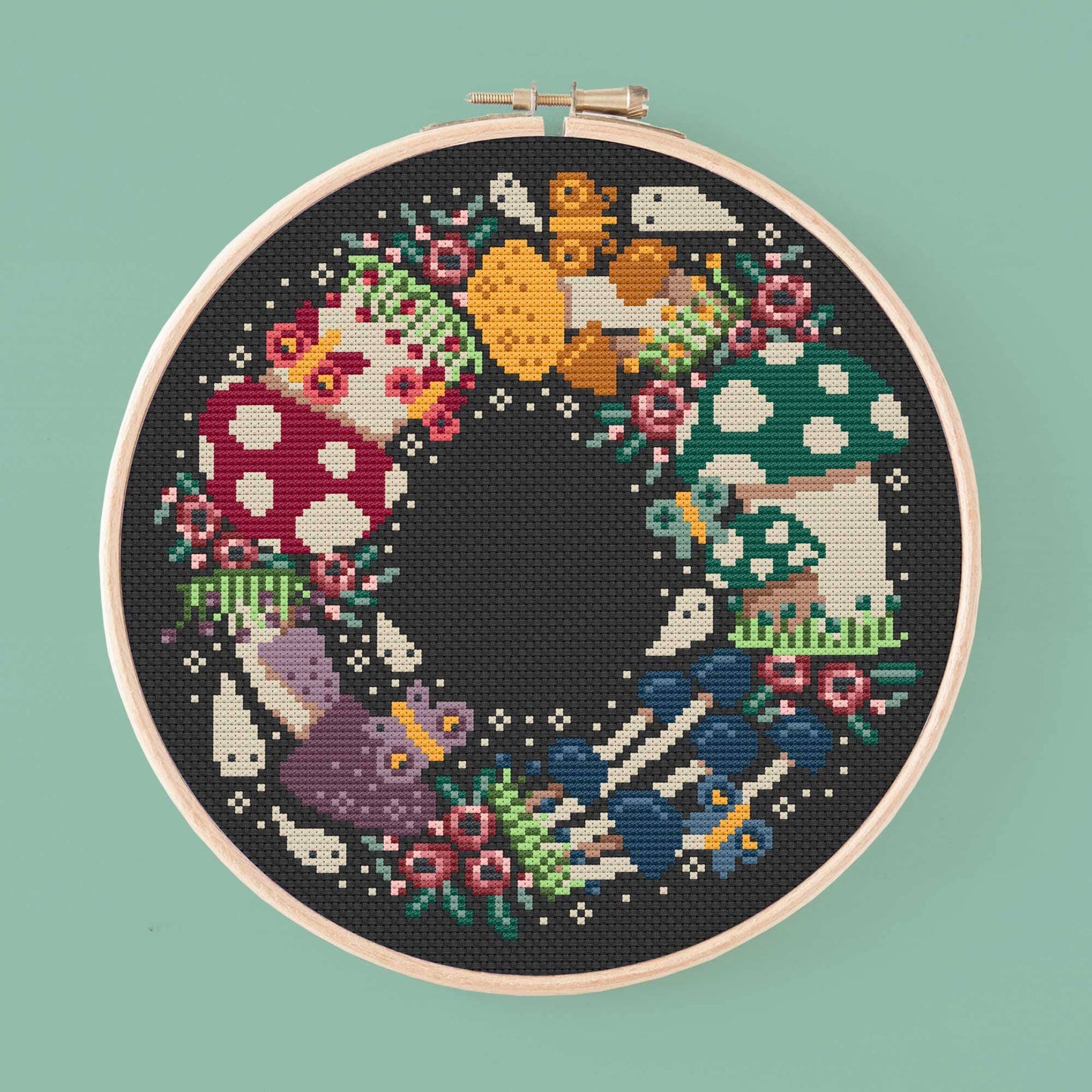 Digital cross stitch pattern of a mushroom circle, also known as fairy ring. This natural formation has always seemed wonderful to me, so I've made my own version, adding lots of fantasy, some butterflies and of course little ghosts. This pattern has just the right mix of cute and dark that I adore.