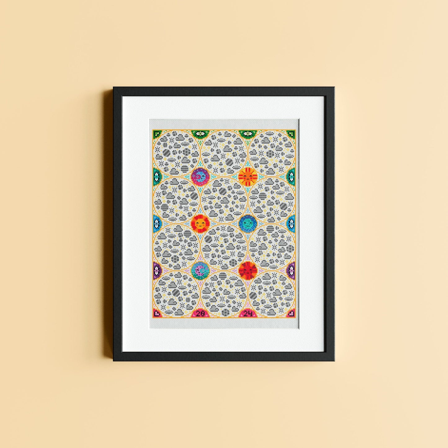 Cross stitch pattern to represent the temperature of your area. The color legend works according to the minimum and maximum temperature of each day, so you will have a unique and personalized sky! Each zone represents a month and each planet or cloud a day of the year.