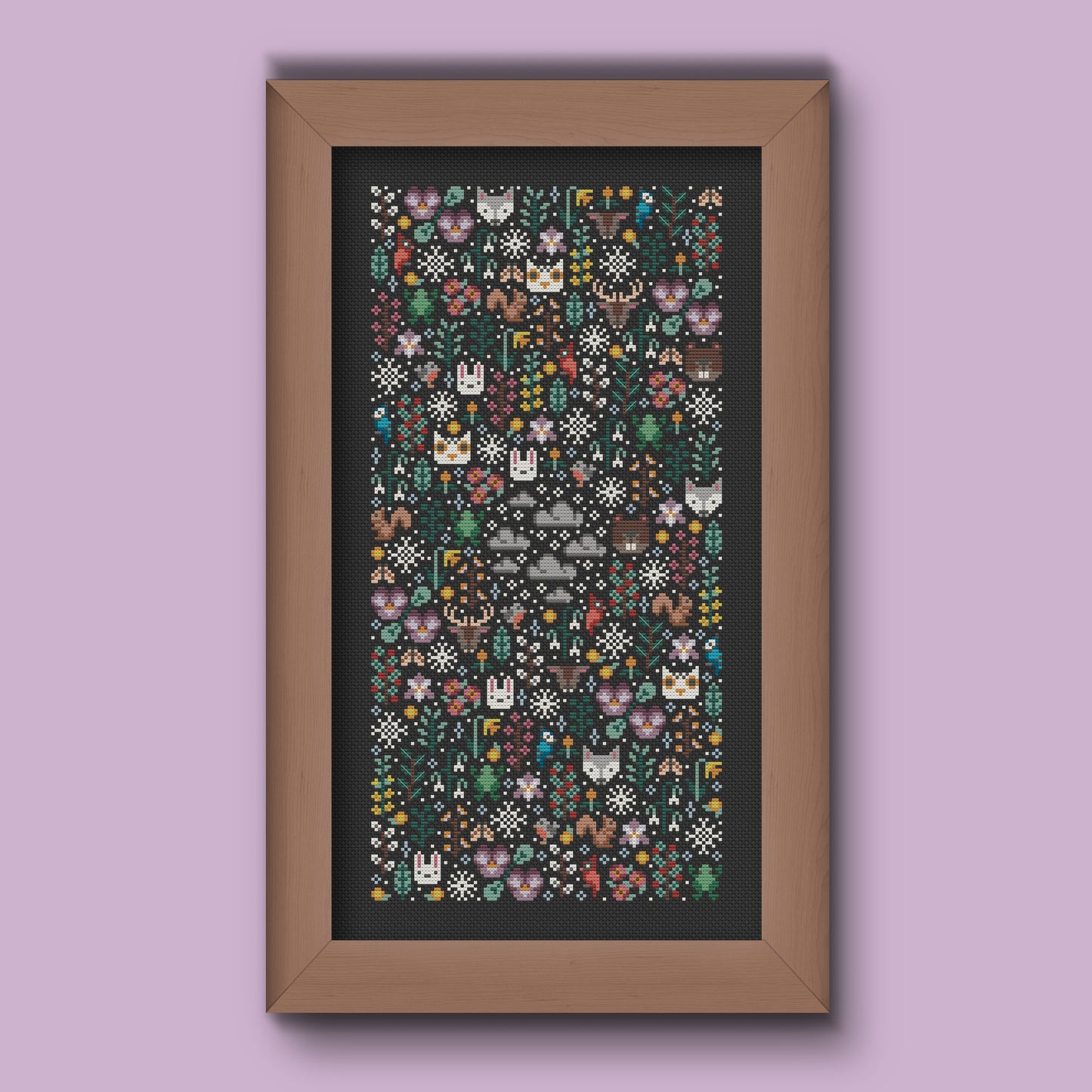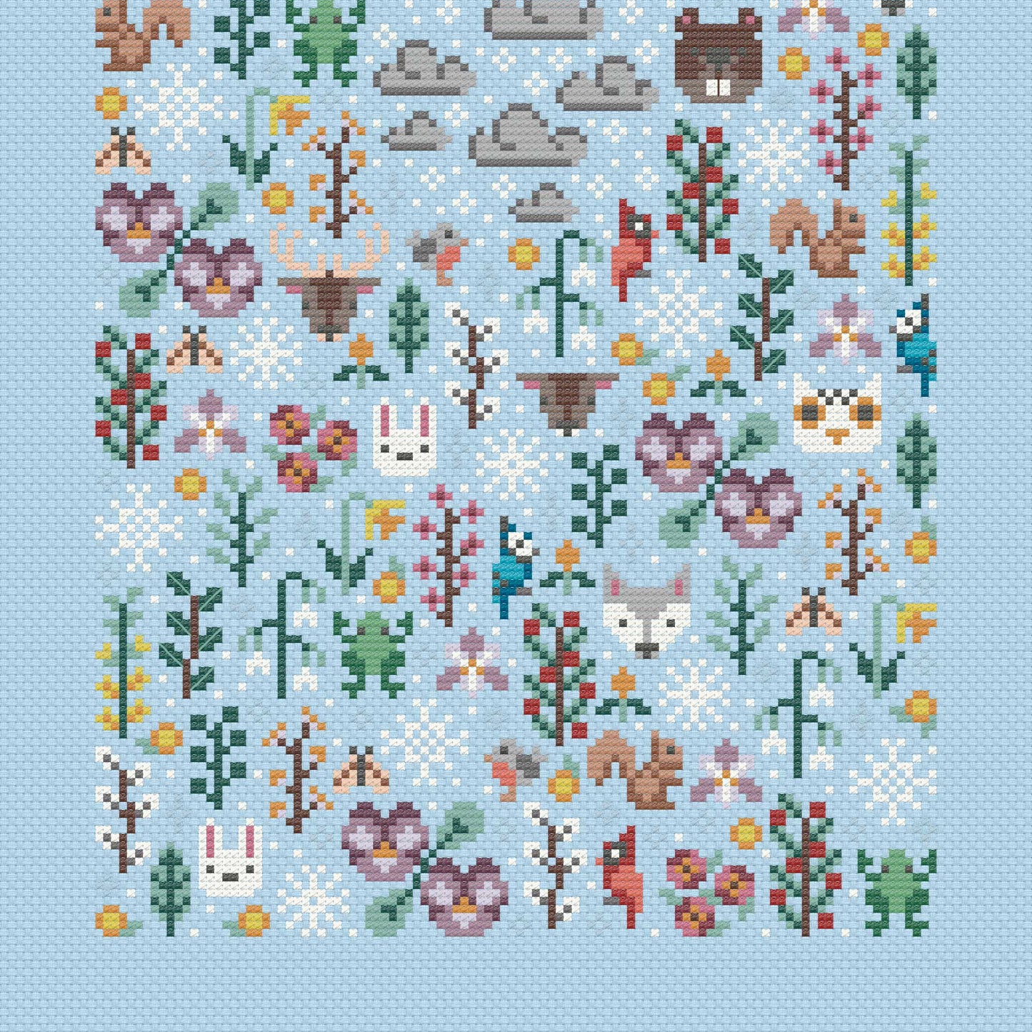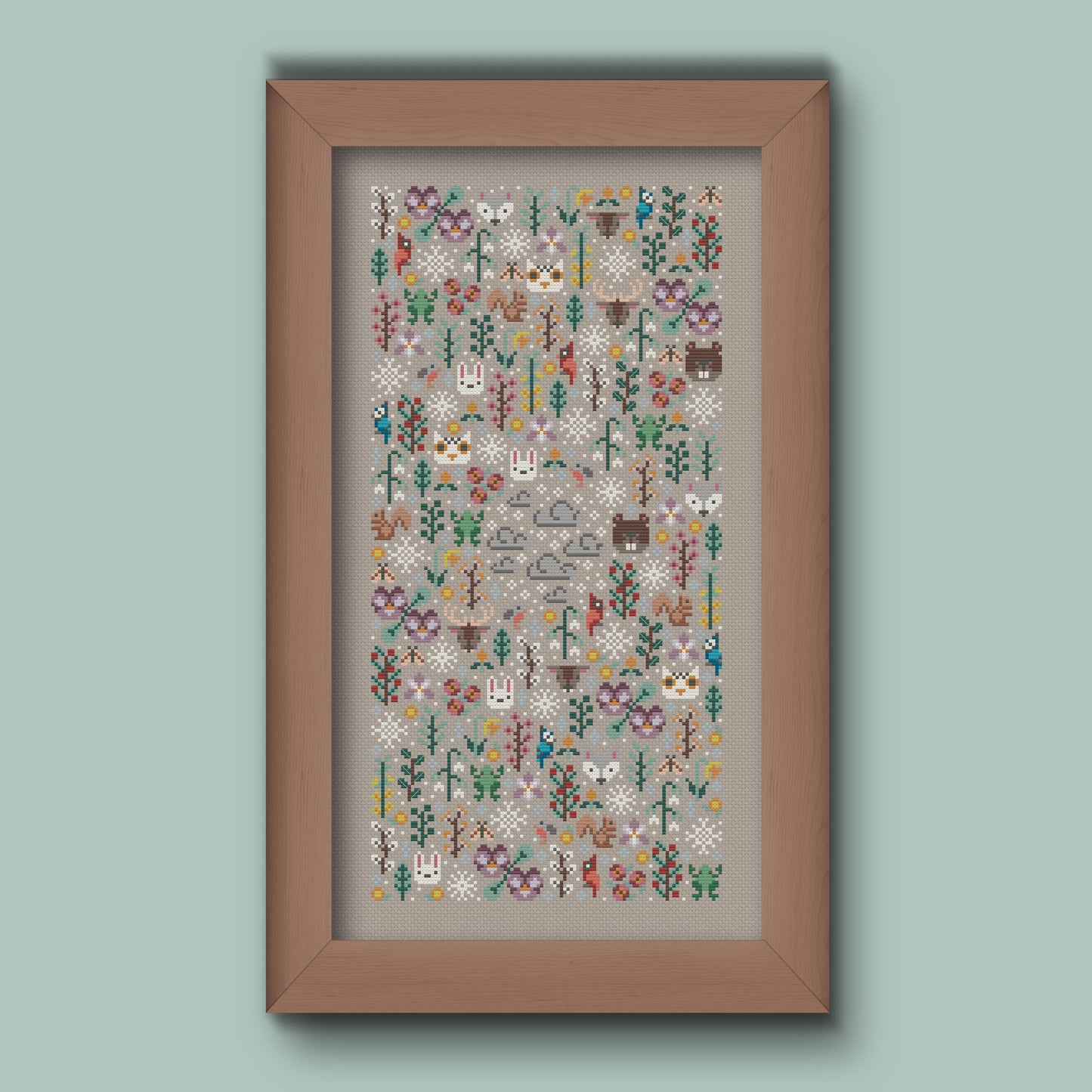 Snow Garden is a large cross-stitch pattern that is very enjoyable to sew, in the classic style of my “garden” designs. It is inspired by winter: cold-resistant flowers, small animals from snowy environments, and a soft color palette that is perfect for quiet days. It is a project designed to be enjoyed without rushing, ideal for embroidering with a cup of hot chocolate by your side and letting that time become your moment of the day.
