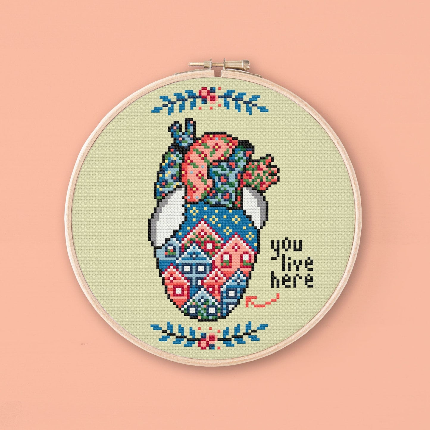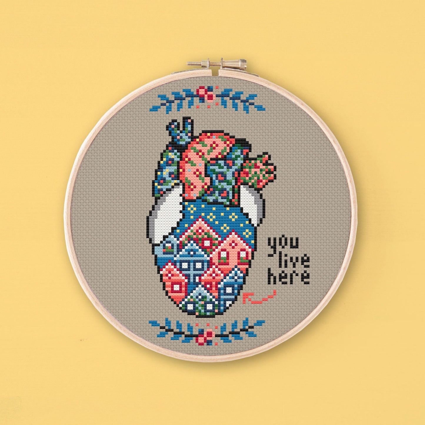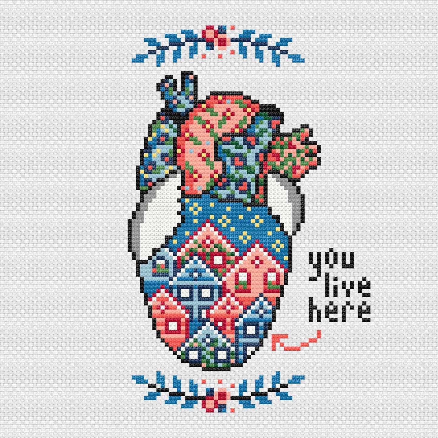 Cross stitch pattern to embroider an anatomical heart full of houses with the phrase "you live here". This pattern is the ideal gift for someone you just love a lot.