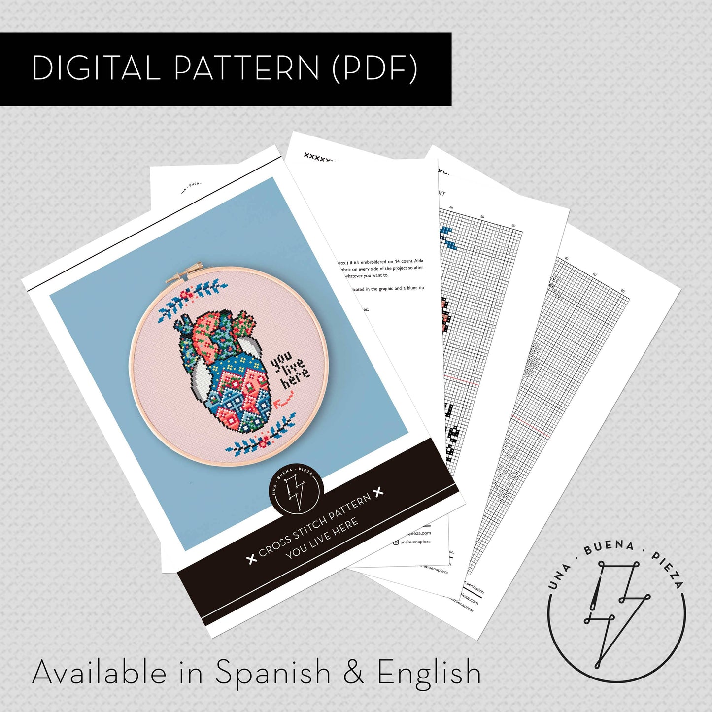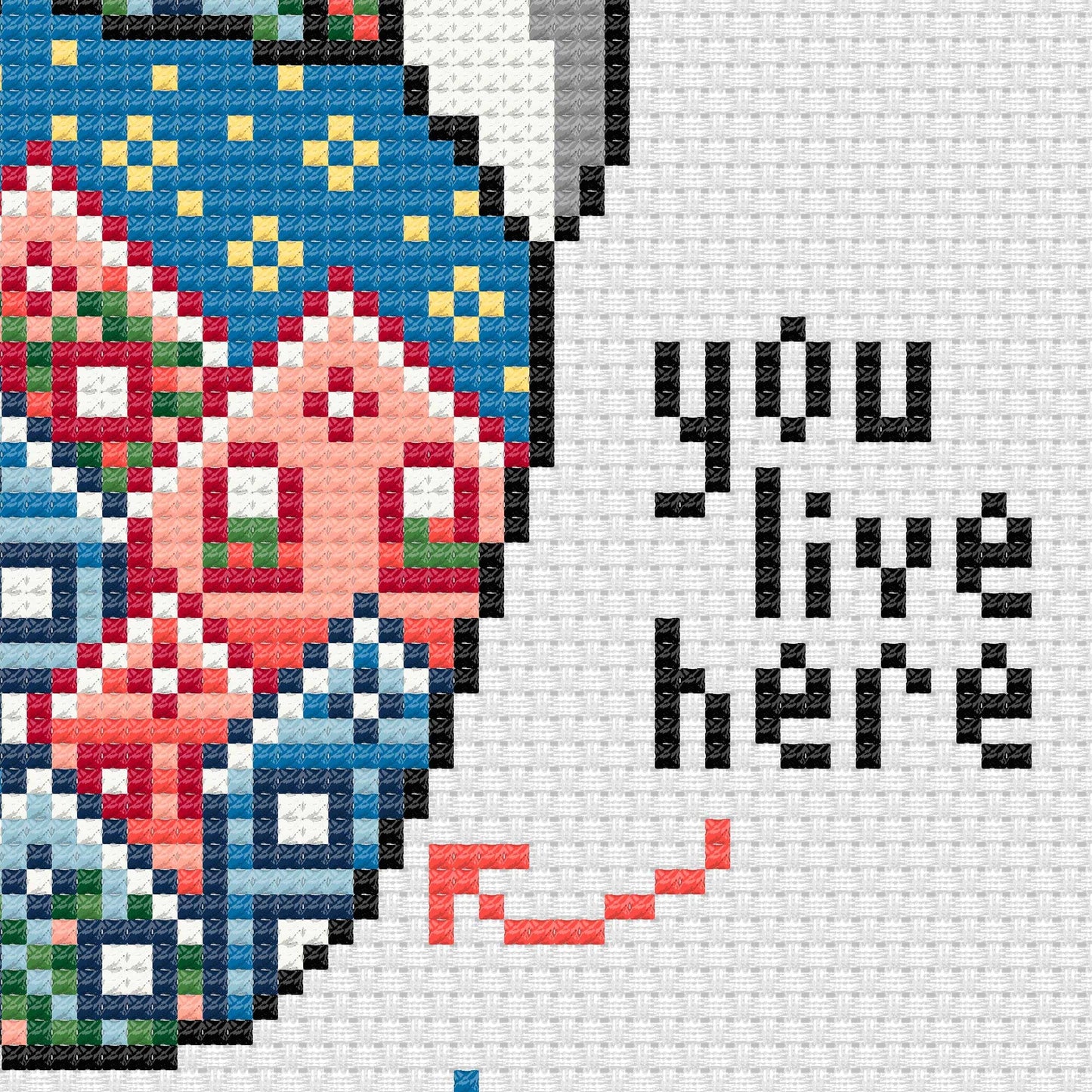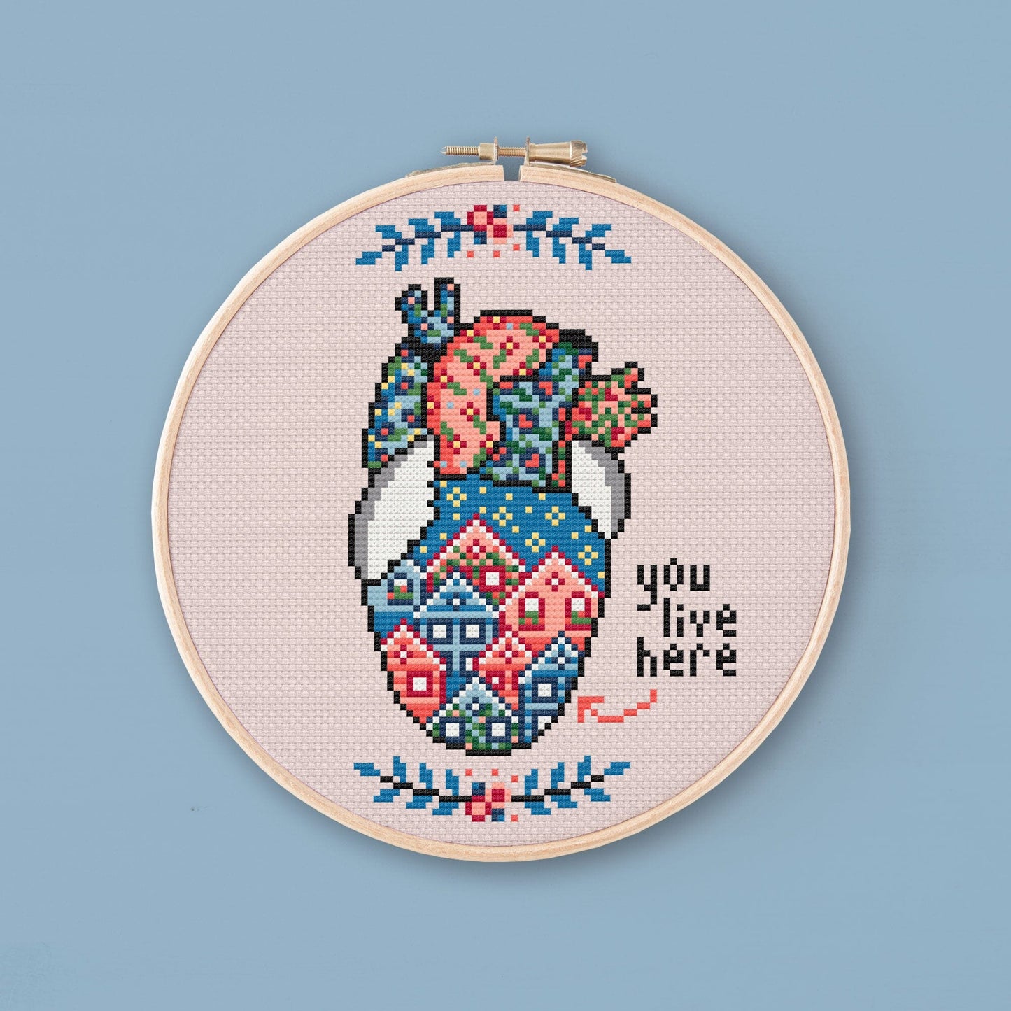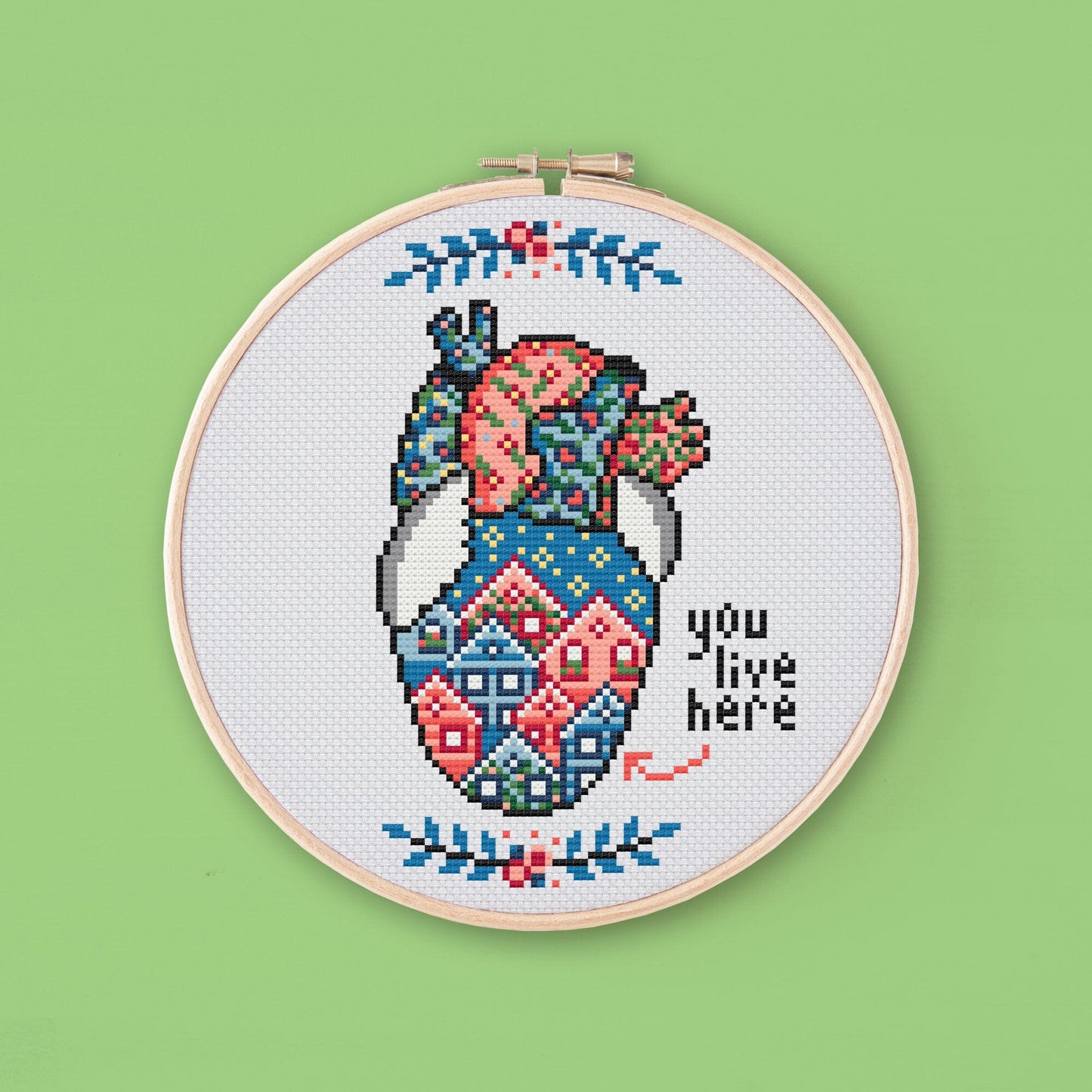 Cross stitch pattern to embroider an anatomical heart full of houses with the phrase "you live here". This pattern is the ideal gift for someone you just love a lot.