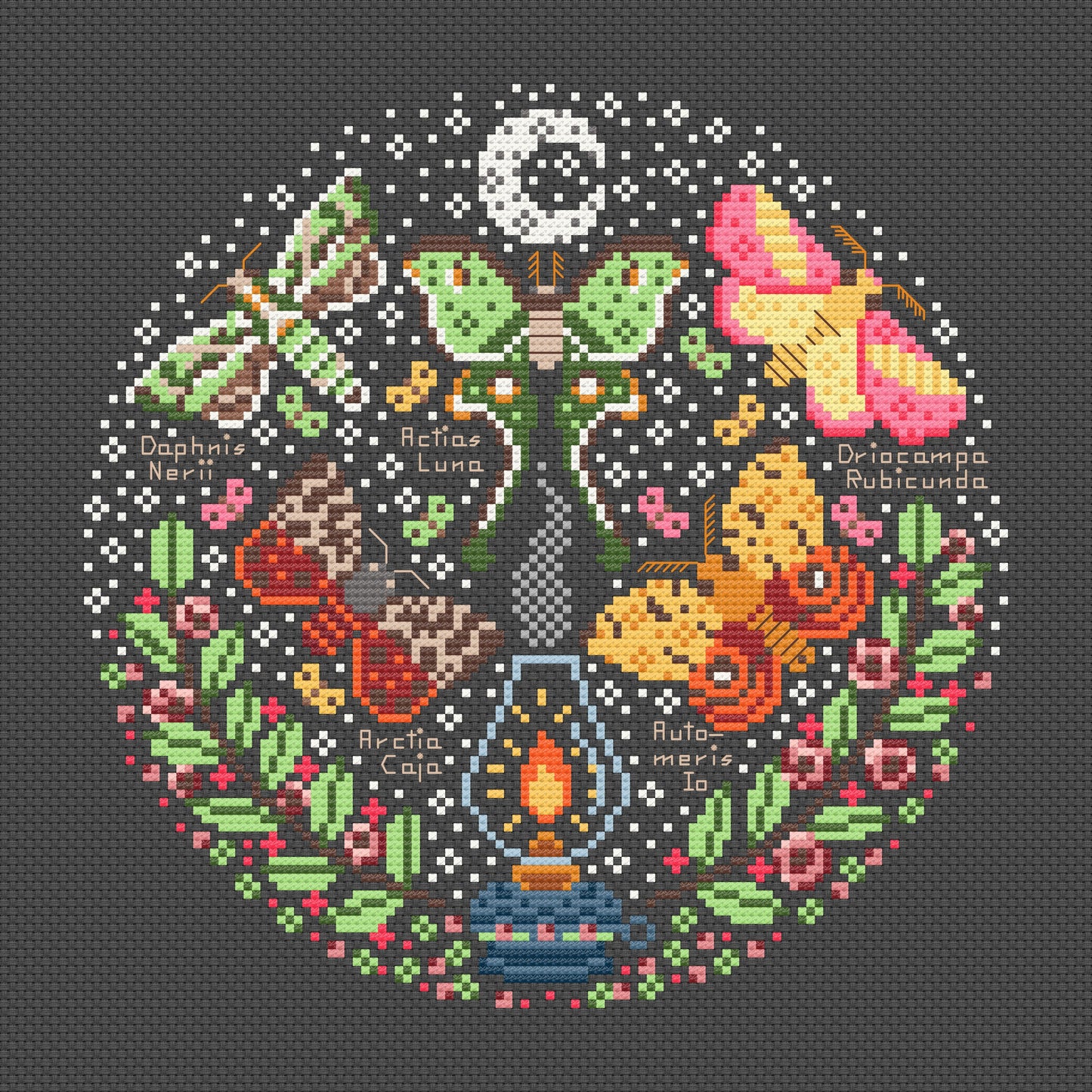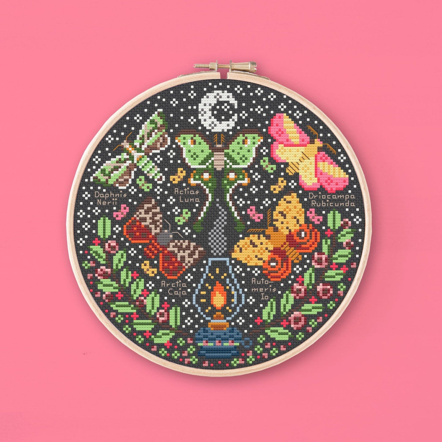 Esquema de punto de cruz para bordar algunas de las polillas más bonitas del mundo. El Esquema de Punto de Cruz en PDF - Polillas Bonitas es ideal para pasar un rato relajante bordando estos bellos insectos llenos de color.