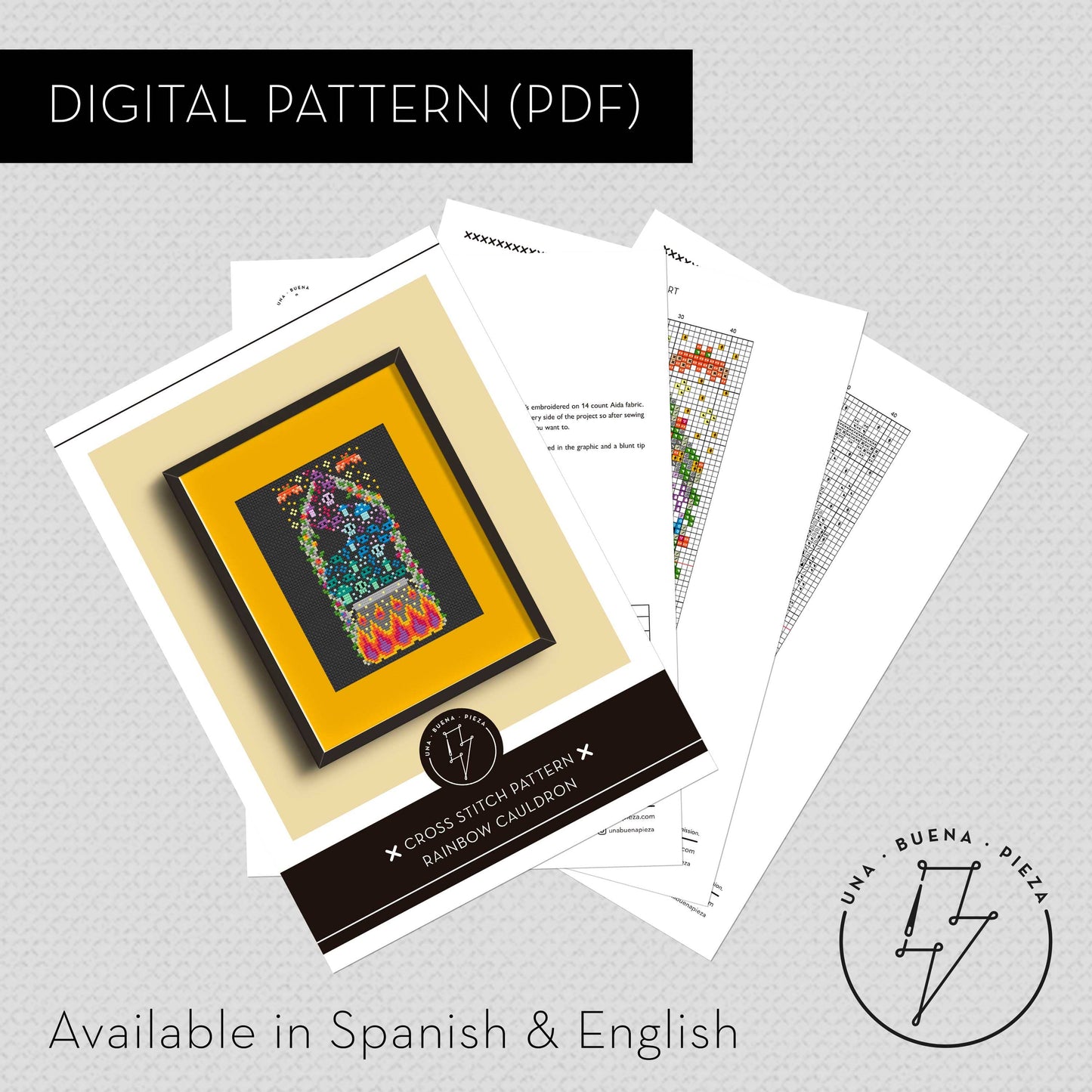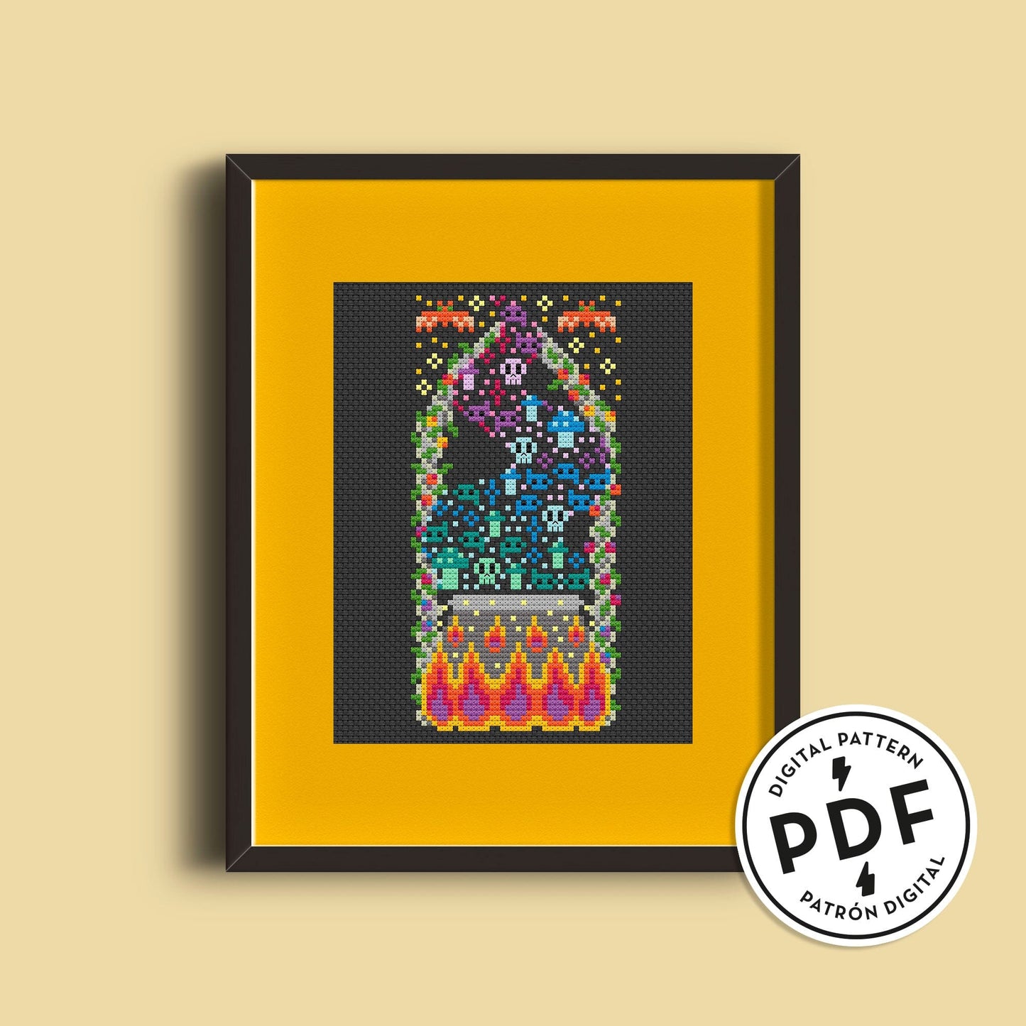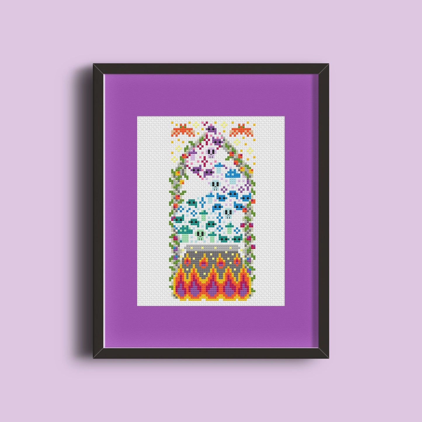 Patrón de punto de cruz en formato digital de un caldero de bruja lleno de color. Este proyecto es ideal para personas que adoran todo lo oscuro y macabro pero también las cosas cuquis y los colores brillantes. ¿Te representa? Entonces este es tu patrón de bordado ideal.