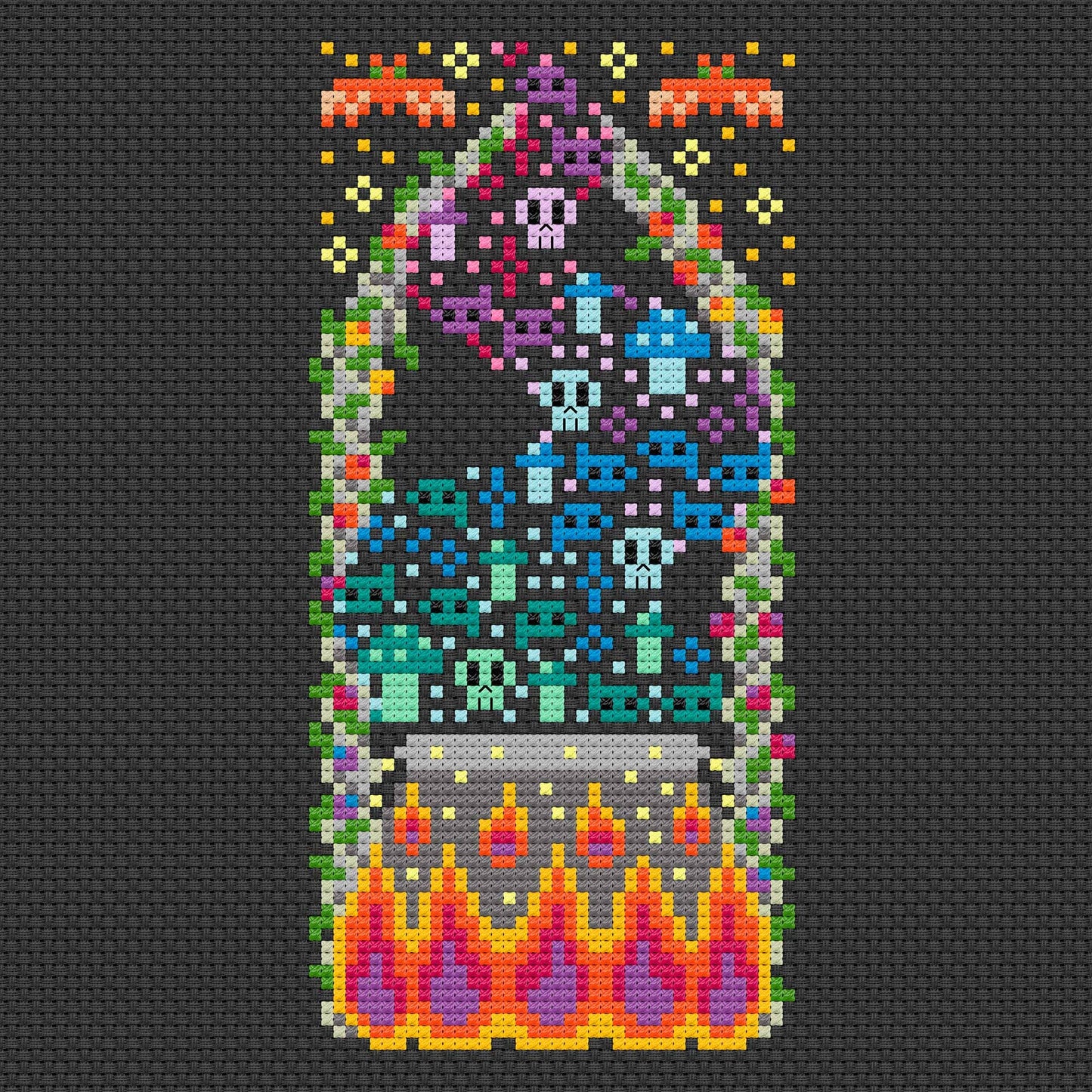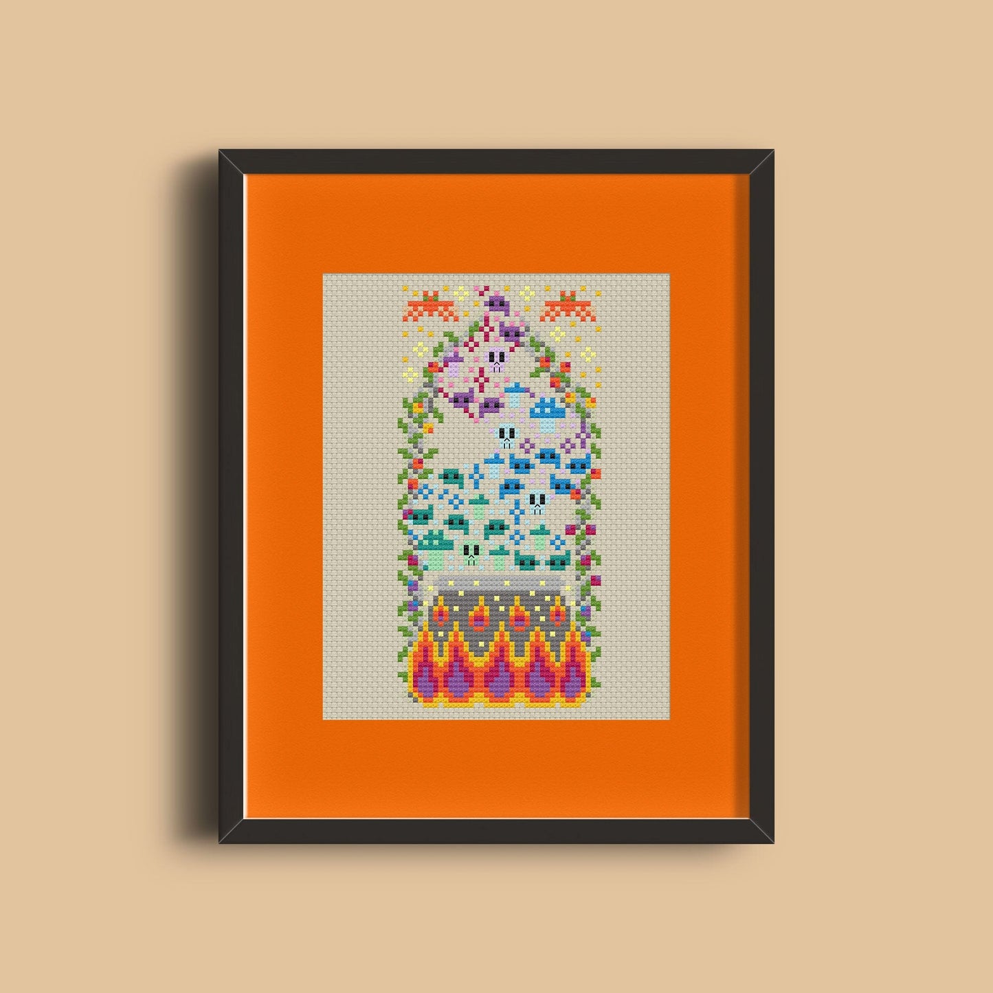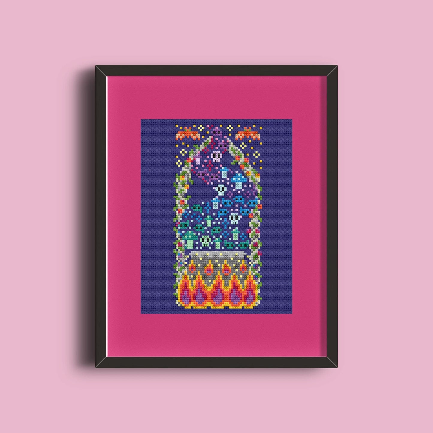 Patrón de punto de cruz en formato digital de un caldero de bruja lleno de color. Este proyecto es ideal para personas que adoran todo lo oscuro y macabro pero también las cosas cuquis y los colores brillantes. ¿Te representa? Entonces este es tu patrón de bordado ideal.