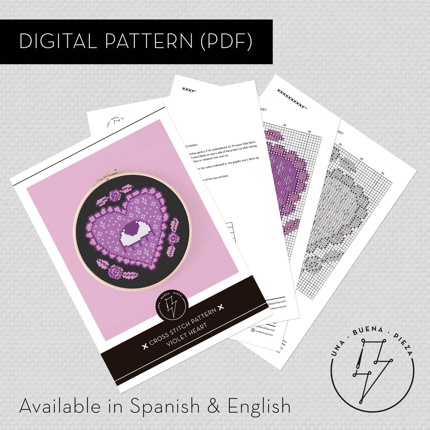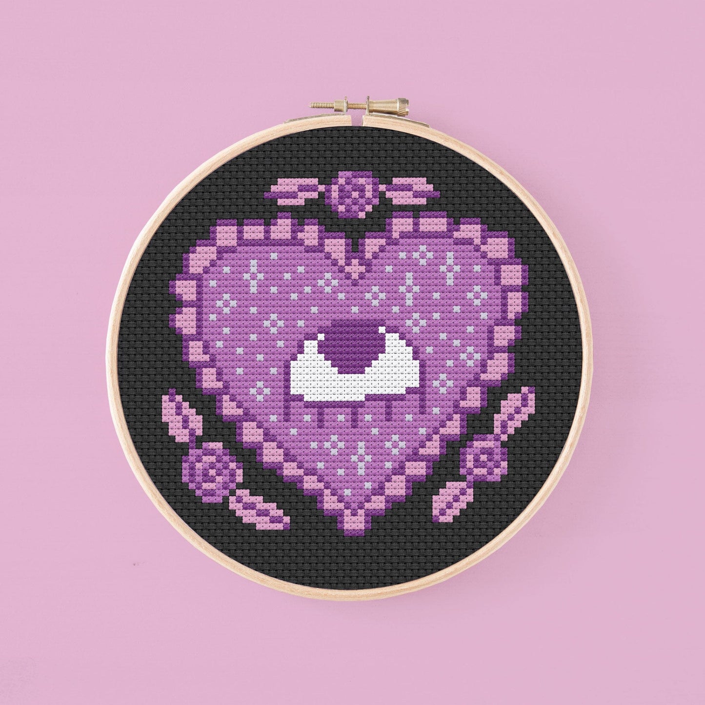 Patrón de punto de cruz para bordar un corazón violeta con un gran ojo. Forma parte de la colección de Valloween. ¿Sabes lo que es?