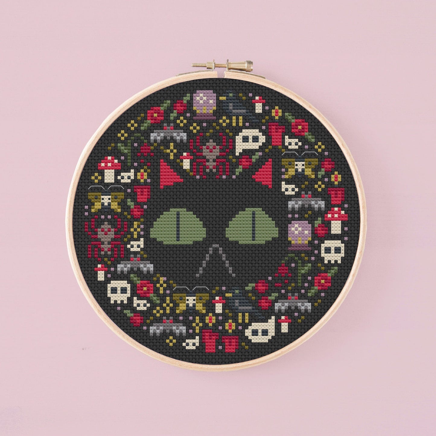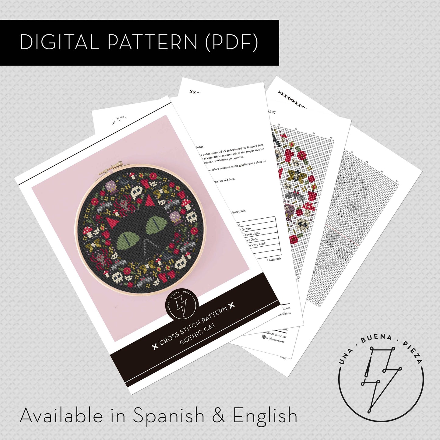 Patrón de punto de cruz en formato digital de un gatito rodeado de elementos de estilo gótico. Este patrón es muy divertido de bordar por todos los pequeños dibujos que tiene y hará las delicias de cualquier amante de los gatos y las cosas oscuras. La silueta del gatito aparecerá una vez termines la labor.