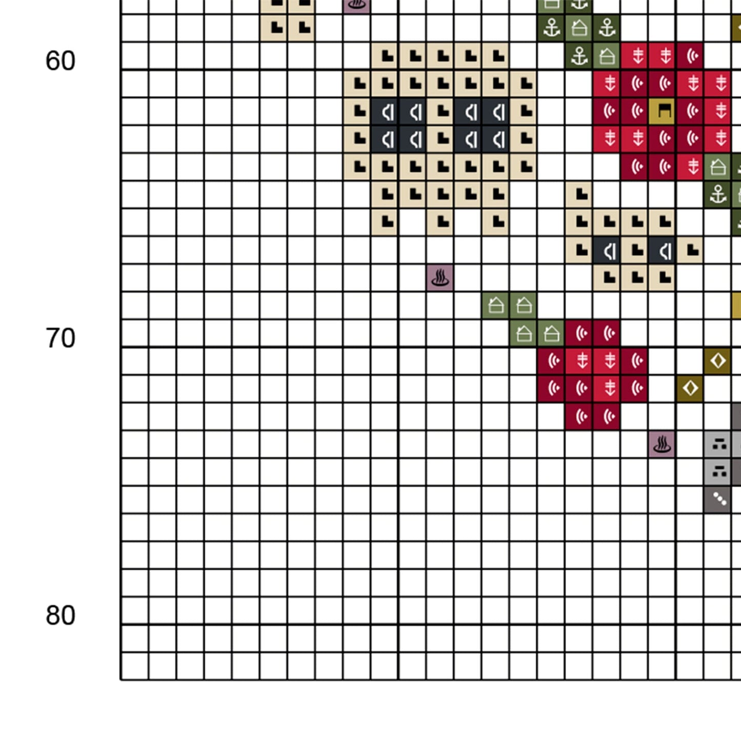 - Tamaño: 80x80 puntos (14x14 cm bordado en tela Aida de 14ct)